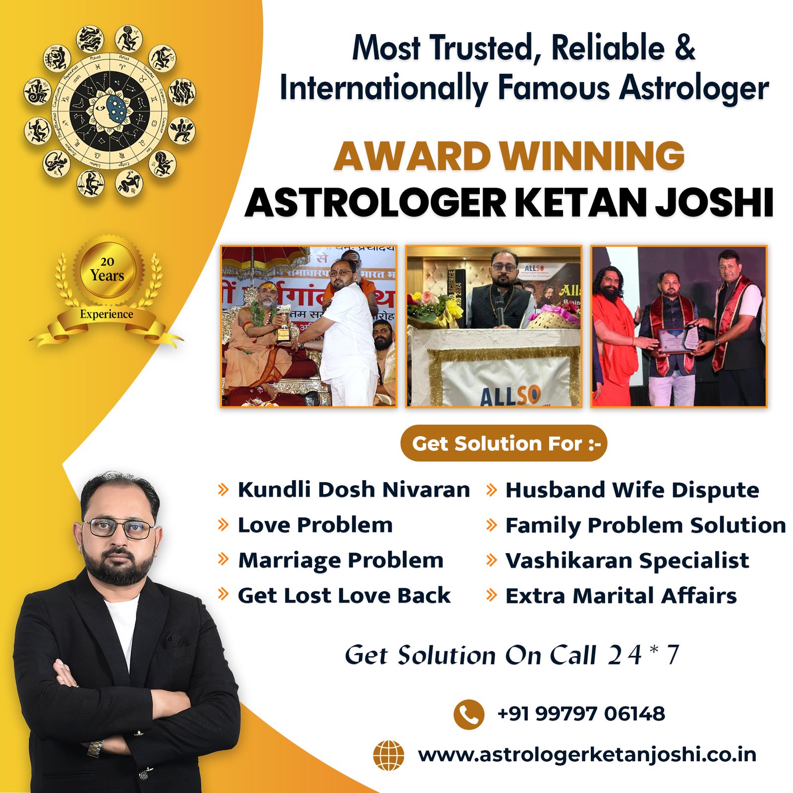 He is master of Vashikaran, Love Vashikaran, Black Magic, Black Magic Removal and Love Problem and capable of solving problems which you are facing in your life. Astrologer Ketan Joshi is a Famous Astrologer located at Ahmedabad, Gujarat, INDIA. Astrologer Ketan Joshi ji is the specialist of Astrology, Vashikaran, Black Magic, Lost Love Back and Love problem solution. He spread his service in all over the world UK, USA, Australia, India, America, Canada, New Zealand, and many other countries.